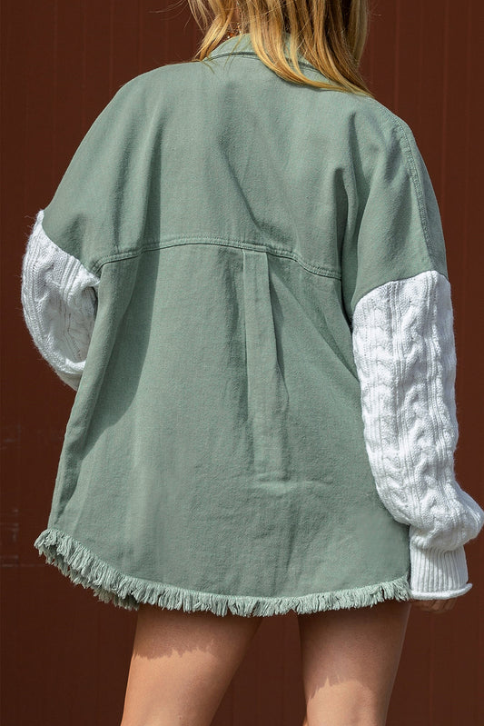 Green Cable Knit Patchwork Sleeve Raw Hem Shacket