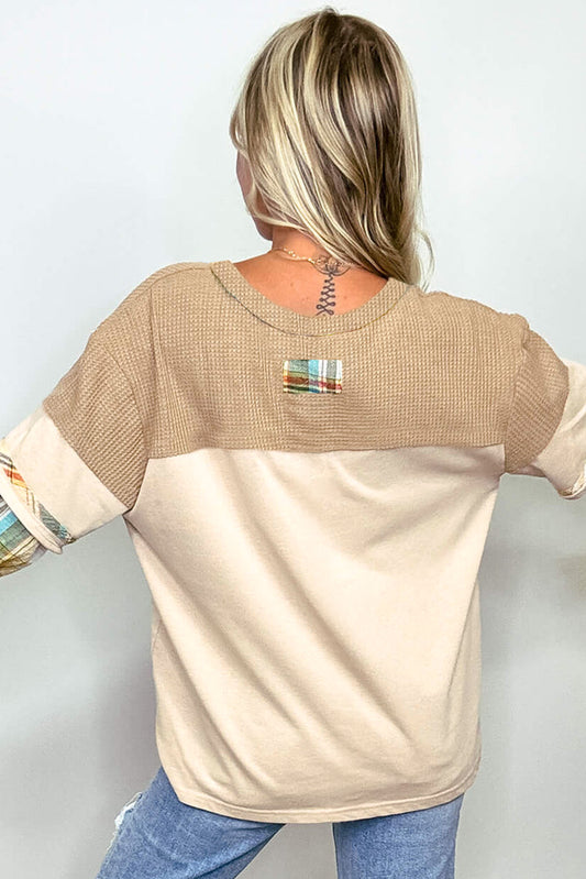 Parchment Plus Size Plaid Waffle Patchwork Henley Top