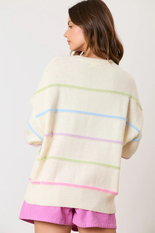 White Rainbow Striped Drop Sleeve Henley Sweater