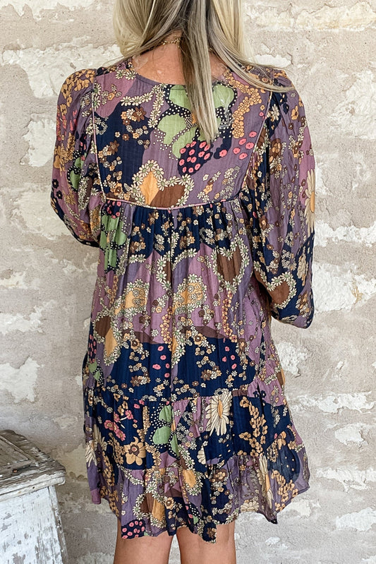 Purple Boho Floral Print Puff Sleeve Flowy Mini Dress