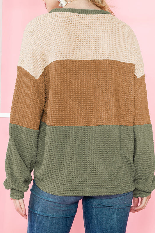 White Leopard Waffle Knit Patchwork Button V Neck Top