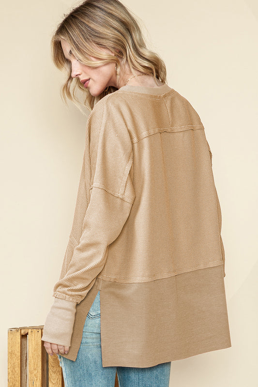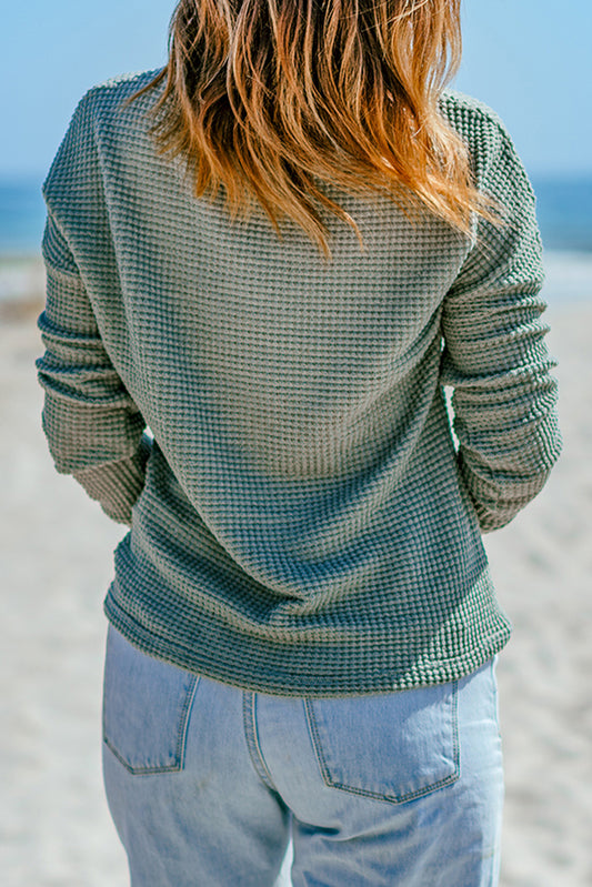 Khaki Waffle Knit Casual Drop Shoulder Long Sleeve Top