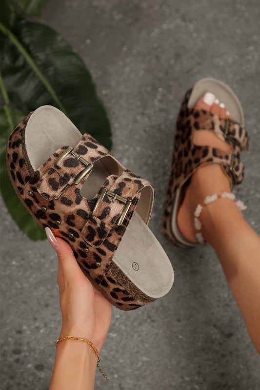 Chestnut Leopard Suede Dual Buckle Strap Platform Slides Shoes